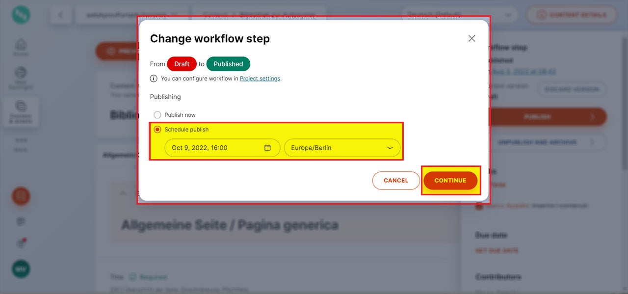 Zudem ist es möglich, ein Datum für die automatische Veröffentlichung der Inhalte einzustellen. Diese Einstellung entspricht der Bezeichnung „Scheduled“ im CMS unter dem Bereich „Home“ der Benutzeroberfläche.