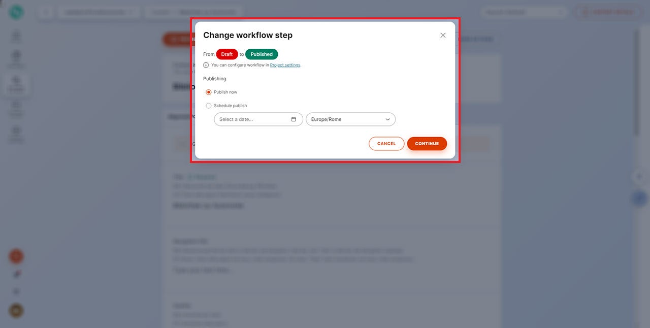 Ermöglicht die Status-Änderung des Inhaltes, z.B. kann vom „Draft“-Status zur Veröffentlichung des Inhaltes übergehen, oder vom archivierten Status zum „Draft“-Status zurückkehren, etc.