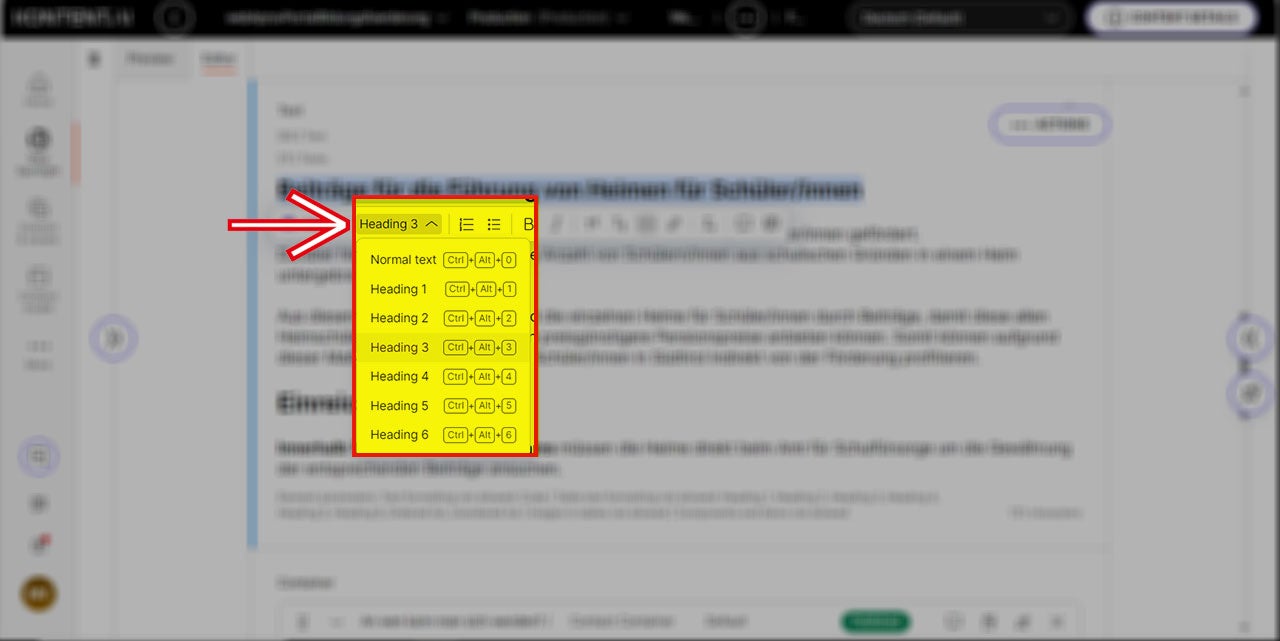 Wenn Sie einen weiteren Untertitel einfügen, müssen Sie zuerst herausfinden, ob dieser auf der gleichen Inhaltsebene wie der vorherige liegt. In diesem Fall muss erneut ein H2 zugewiesen werden. Befindet er sich hingegen auf einer niedrigeren Ebene, wählen Sie einen „H3“-Untertitel.
