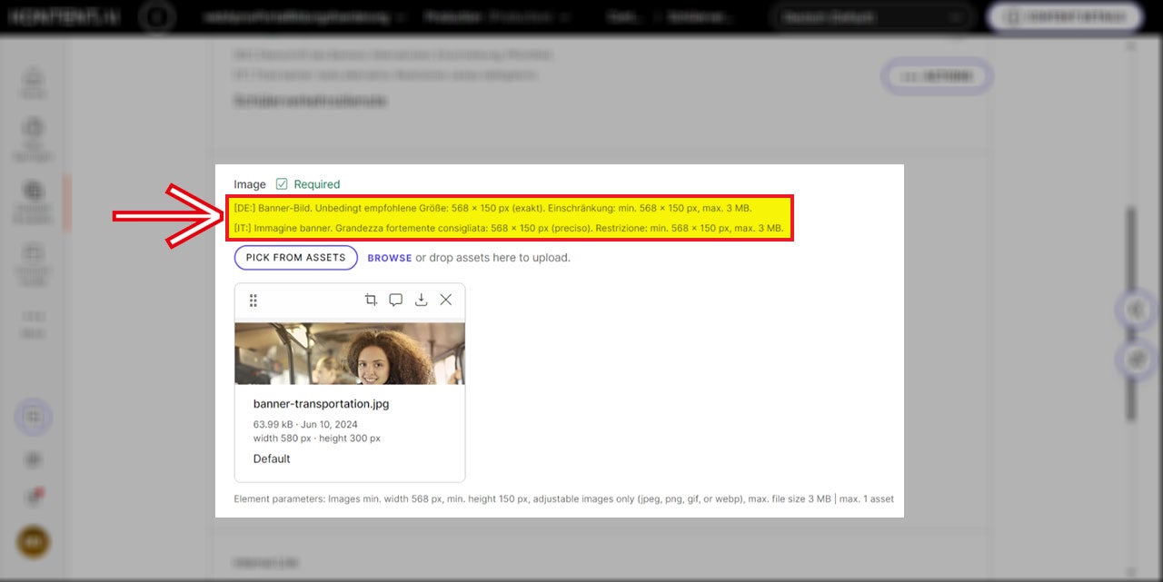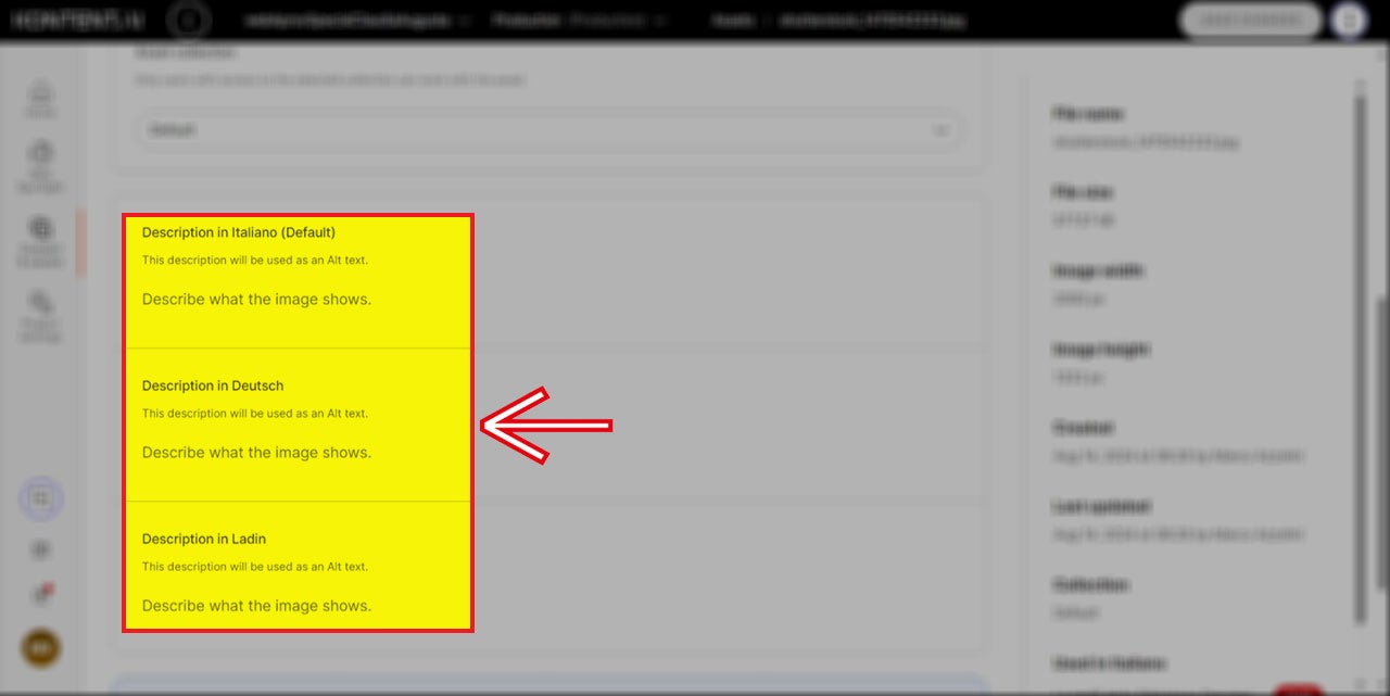 Dies gilt für alle Sprachversionen des Projekts. Es empfiehlt sich, die Beschreibungen direkt im Bereich „Assets“ unter dem Menüpunkt „Content & Assets“ einzugeben.