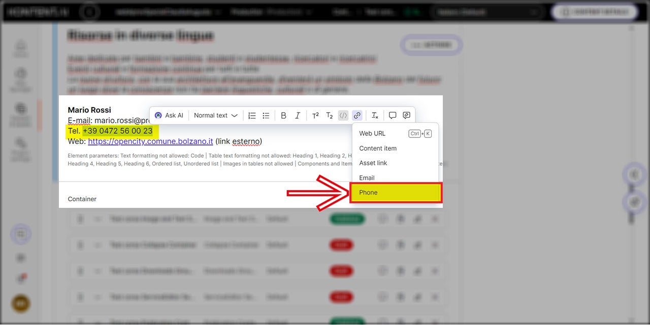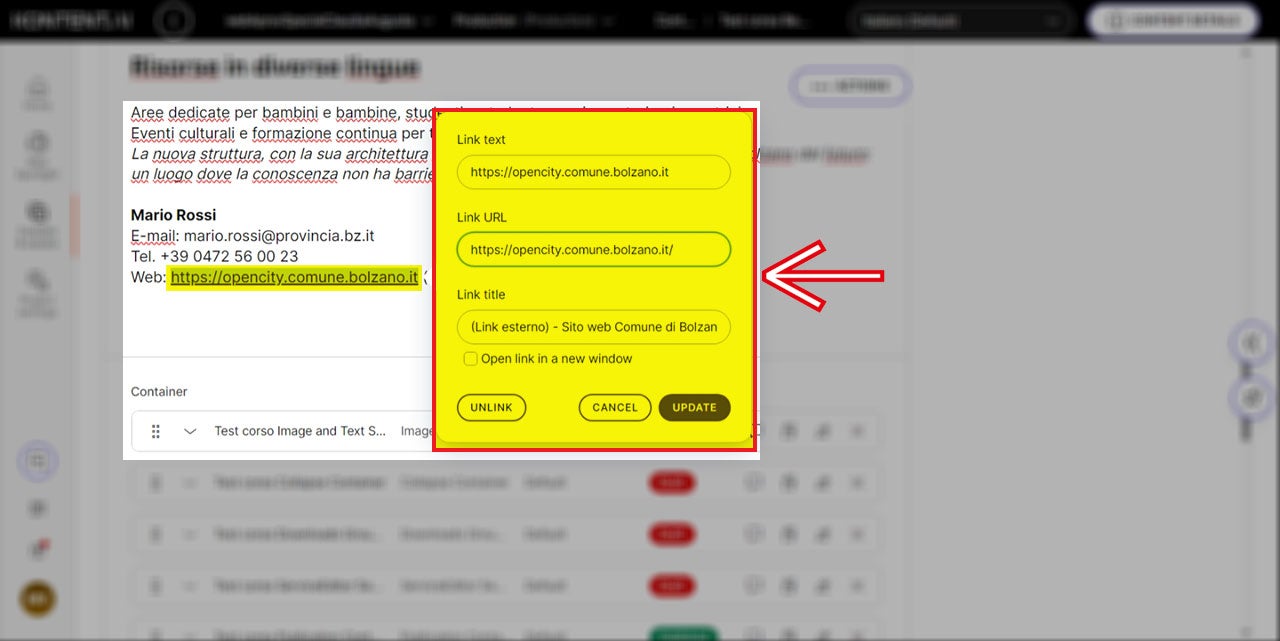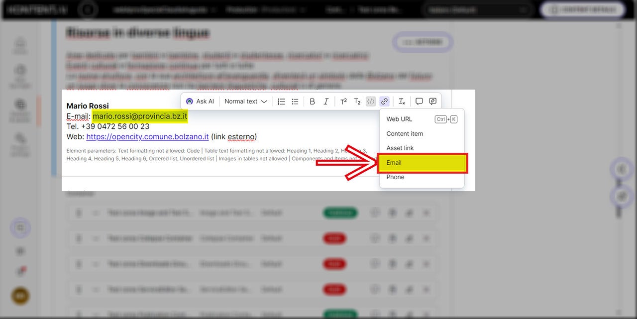 Außerdem sollte kein „mailto:“ vorangestellt werden, wie es beim alten OpenText CMS der Fall war. Jetzt genügt es, nur die E-Mail-Adresse in das dafür vorgesehene Feld einzutragen.