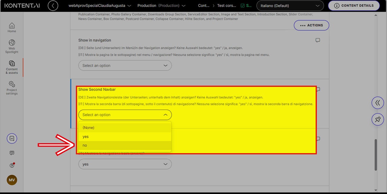 Wenn Sie sich entscheiden, Boxen als Alternative zur sekundären Navigation, auch Second Navbar genannt, zu erstellen, denken Sie daran, letztere am Ende der Seite in dem dafür vorgesehenen Bereich des CMS-Editors auszublenden.