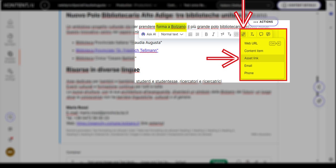 Im Allgemeinen kann ein Text, der auf die neue Seite kopiert wird und einen Link zu einem Dokument enthält, nicht denselben Link zu den OpenText-Dokumenten beibehalten: die Dokumente müssen in kontent.ai neu hochgeladen werden.